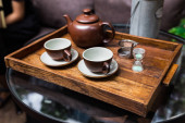 Hot Flower Tea serwowane przez przelewanie z kubka przez sito ze stali nierdzewnej herbaty wlewu w brązowej filiżanki porcelany.