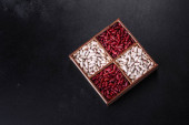 Kilka rodzajów wielobarwnej fasoli leży w formie pionowych pasków na konkretnym tle