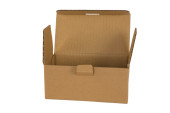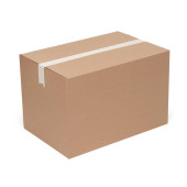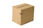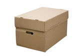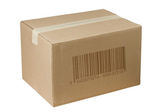 Closed shipping cardboard box whit white empty label