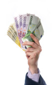 Ręce mężczyzny oferujące banknoty euro w wentylatorze