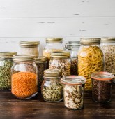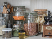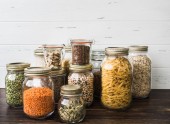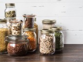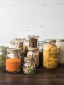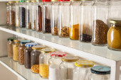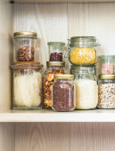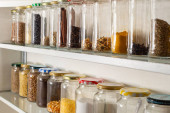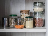 Półka w kuchni z różnymi zbożami i nasionami