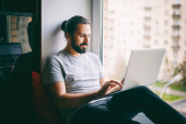 Zdjęcie "Miejsce pracy w domu. Mężczyzna pracuje przy laptopie w domu, siedzi przy stole w salonie w ciągu dnia. Praca w domu." może być wykorzystywane do celów osobistych i komercyjnych zgodnie z warunkami zakupionej licencji Royalty-free. Obraz jest dostępny do pobrania w jakości wysokiej rozdzielczości do 5760x3840.