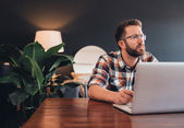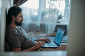 Miejsce pracy w domu. Mężczyzna pracuje przy laptopie w domu, siedzi przy stole w salonie w ciągu dnia. Praca w domu.
