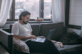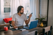Miejsce pracy w domu. Mężczyzna pracuje na laptopie w domu, siedzi na kanapie w salonie w ciągu dnia, rozmawia przez telefon. Praca w domu.