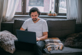 Zdjęcie "Miejsce pracy w domu. Mężczyzna pracuje na laptopie w domu, siedzi na kanapie w salonie w ciągu dnia, rozmawia przez telefon. Praca w domu." może być wykorzystywane do celów osobistych i komercyjnych zgodnie z warunkami zakupionej licencji Royalty-free. Obraz jest dostępny do pobrania w jakości wysokiej rozdzielczości do 5760x3840.