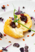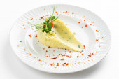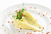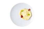tłuczone ziemniaki z masłem i zielenią ozdobione plasterkiem pomidora i czerwoną papryką na białym talerzu