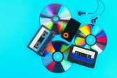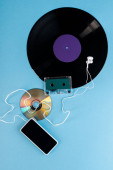 widok z góry vintage płyty winylowej, dysk kompaktowy, słuchawki, taśmy audio i smartfon z pustym ekranem na niebieski, koncepcja ewolucji