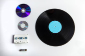 Zdjęcie "widok z góry vintage płyty winylowej, dysk kompaktowy, słuchawki, taśmy audio i smartfon z pustym ekranem na niebieski, koncepcja ewolucji " może być wykorzystywane do celów osobistych i komercyjnych zgodnie z warunkami zakupionej licencji Royalty-free. Obraz jest dostępny do pobrania w jakości wysokiej rozdzielczości do 5760x3840.