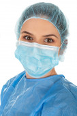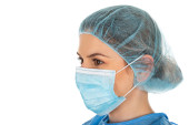 Portret młodej chirurżki w mundurze ochronnym, masce, czapce i rękawiczkach na odizolowanym tle