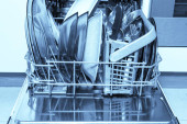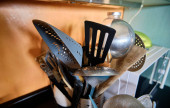 Nieczyste brudne naczynia, naczynia kuchenne, naczynia i zastawy stołowe starszego emeryta z demencją starczą.