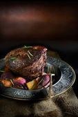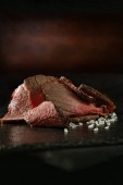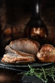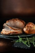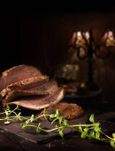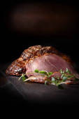 Rzadko krojona pieczona wołowina na ciemnym, rustykalnym tle ozdobiona zielem tymianku. Szczodre zakwaterowanie dla miejsca kopiowania.