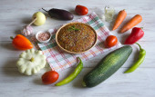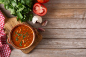 widok z góry na garnek zupy pomidorowej na starym drewnianym stole