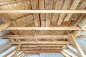widok drewnianych krokwi przy montażu dachu na budowie domu