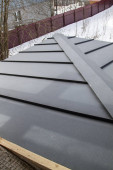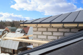 z bliska widok rusztowania i domu w budowie z szarym dachem składanym na warstwie hydroizolacyjnej