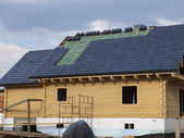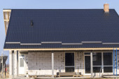 z bliska widok rusztowania i domu w budowie z szarym dachem składanym na warstwie hydroizolacyjnej