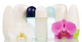 Dezodoranty kulkowe i kwiat storczyka izolowane na białym tle.