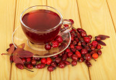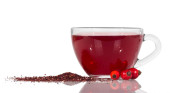 Jagody róży i szklanka napoju wyizolowane na białym tle.