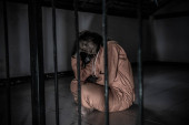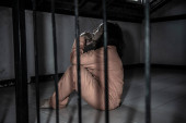 Portret kobiety desperacko chcącej złapać żelazne więzienie, koncepcja więźnia
