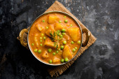 Aloo Curry Sabzi wykonane przy użyciu gotowanego ziemniaka z zielonym groszkiem. Serwowane w misce lub karahi, selektywne skupienie
