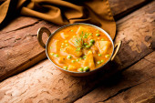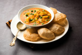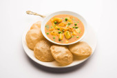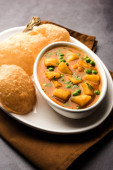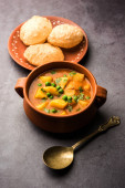 Aloo Puri lub curry ziemniaczane ze smażonym Poori, popularne indyjskie śniadanie / obiad / kolacja menu.