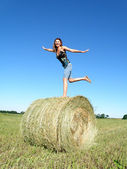 Młody rudowłosy szczupły dziewczyna europejski wygląd w czarny i żółty odzież siadam na stóg siana na pole pod słońce