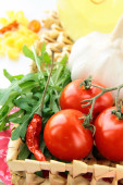 Martwa żywotność włoskiej żywności (oliwa, olej, makaron, ser )