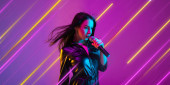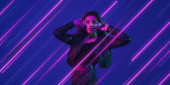 Piękny portret kobiet z dmuchanie włosy na ciemnym tle studio w kolorowe neonowe światło