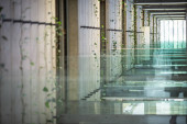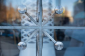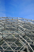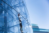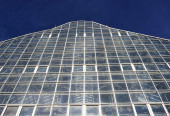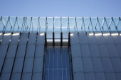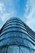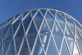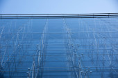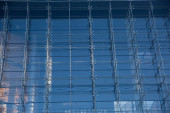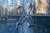 Nowoczesny i jednocześnie wysoki budynek ze szklaną fasadą i stalowymi mocowaniami.