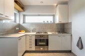 Elegancka kuchnia z białymi meblami i czarnymi blatami otwarta na jadalnię z drewnianym stołem
