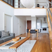 Dwupiętrowy apartament ze stylowym salonem z szarą sofą i drewnianym stołem do kawy otwartym na jadalnię ze stołem dla czterech osób