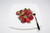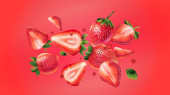 Truskawkowy koktajl mleczny z owocami, na niebieskim tle