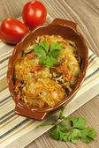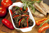 ahşap masa üzerinde seramik dishware içinde kızarmış tavuk ciğeri