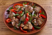ahşap masa üzerinde seramik dishware içinde kızarmış tavuk ciğeri