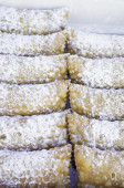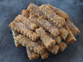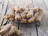 Domowe jedzenie. Shortbread Sticks posypane cukrem i makiem na metalowym ruszcie na ciemnym tle. Zbliżenie, widok z boku.