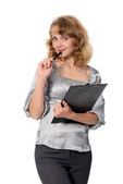 biznes kobieta z folderu trzymając rękę prezentacji produktu.