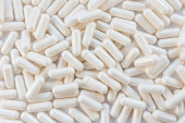 białe tabletki z białym proszkiem z bliska widok z góry