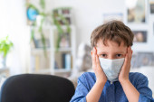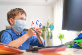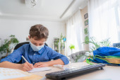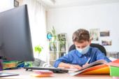 Zdjęcie "Smutny chłopak w masce z komputerem odrabia lekcje podczas kwarantanny koronawirusowej. koncepcja edukacji online. Odległość społeczna, samoizolacja. Uczenie się na odległość z powodu wirusa, grypy, epidemii COVID-19" może być wykorzystywane do celów osobistych i komercyjnych zgodnie z warunkami zakupionej licencji Royalty-free. Obraz jest dostępny do pobrania w jakości wysokiej rozdzielczości do 5760x3840.