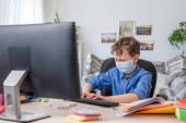 Smutny chłopak w masce z komputerem odrabia lekcje podczas kwarantanny koronawirusowej. koncepcja edukacji online. Odległość społeczna, samoizolacja. Uczenie się na odległość z powodu wirusa, grypy, epidemii COVID-19