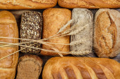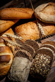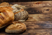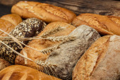 Różne bochenki chleba i bułki z pszenicą i mąką na drewnianym stole