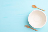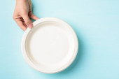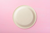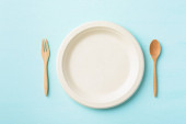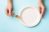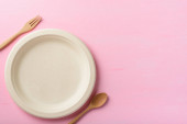Biodegradowalna płyta, płyta kompostowalna lub przyjazna dla środowiska jednorazowa płyta gospodarstwa ręcznie na pastelowym tle koloru, widok z góry