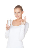 Młoda kobieta ze szklanką wody i witaminą na białym tle