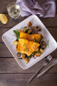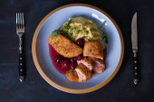 Pieczona wieprzowina z sosem pieprzowym, szparagami, ziemniakami i pomidorami. Widok z góry, widok z góry