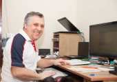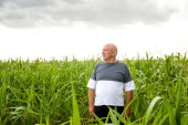 Stary siwy dziadek w letni dzień w brzozowym gaju.