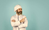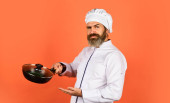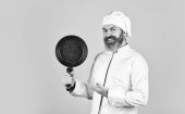 Zdrowe jedzenie. gotowanie smaczne danie. Brodaty trzymają patelnię. Gotowanie w garnku. do przygotowywania jedzenia. Brodatego mężczyznę gotującego w kuchni. kuchnia i kuchnia. Naczynia kuchenne. przestrzeń kopiowania