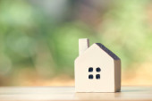 Dom model izolowany na drewnianym tle. koncepcja ubezpieczenia inwestycyjnego.Nieruchomości Concept.Wooden house.white dom zabawki - dom zakup hipoteki koncept.Copy miejsca