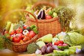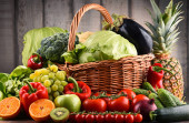 świeżych organicznych warzyw w wiklinowym koszu w ogrodzie