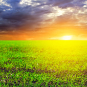 zielone pole wiejskie na wzgórzu o zachodzie słońca