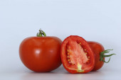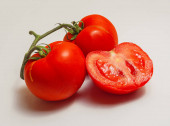 Red sweet pepper and tomato isolated on black background