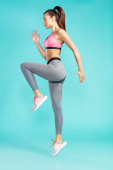 Asian slim Fitness kobieta ćwiczenia rozgrzewka rozciągnąć skoki sprężynowe nogi, studio oświetlenie żółty beżowy musztarda tło słońce cień przestrzeń kopia, koncepcja kobieta może zrobić sportowiec Sport 6 opakowania
