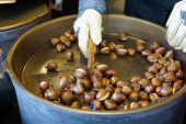 Widok męskich rąk mieszających i pieczących pyszne organiczne kasztany na gazowym piecu z drewnianą chochlą